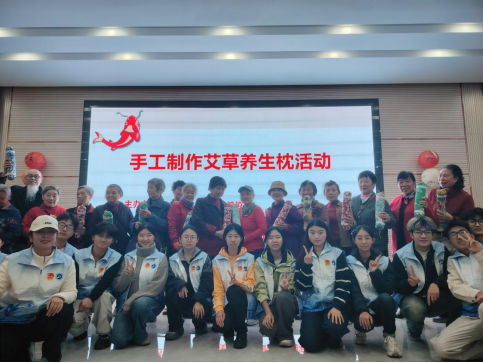 由武汉工程大学校青年志愿者协会、晨曦志愿者服务队主持制作养生枕活动,带来了浓浓的艾草清香,志愿者们和社区工作人员一起将提前准备好的艾草包、各种颜色的枕套和内胆发给现场居民。志愿者同学讲解艾草的功效和用途,以及艾草枕的制作方法。艾草作为传承百年的养生佳品,具有温经散寒、活血通络的良效。先将艾草叶装入粗布内胆,装满后封口,再装入枕套中,再次封口后制作完成。青年志愿者与老人们一对一结对,共同完成养生枕的制作。在志愿者帮助下,一个个精致的艾草养生枕展现在大家眼前。